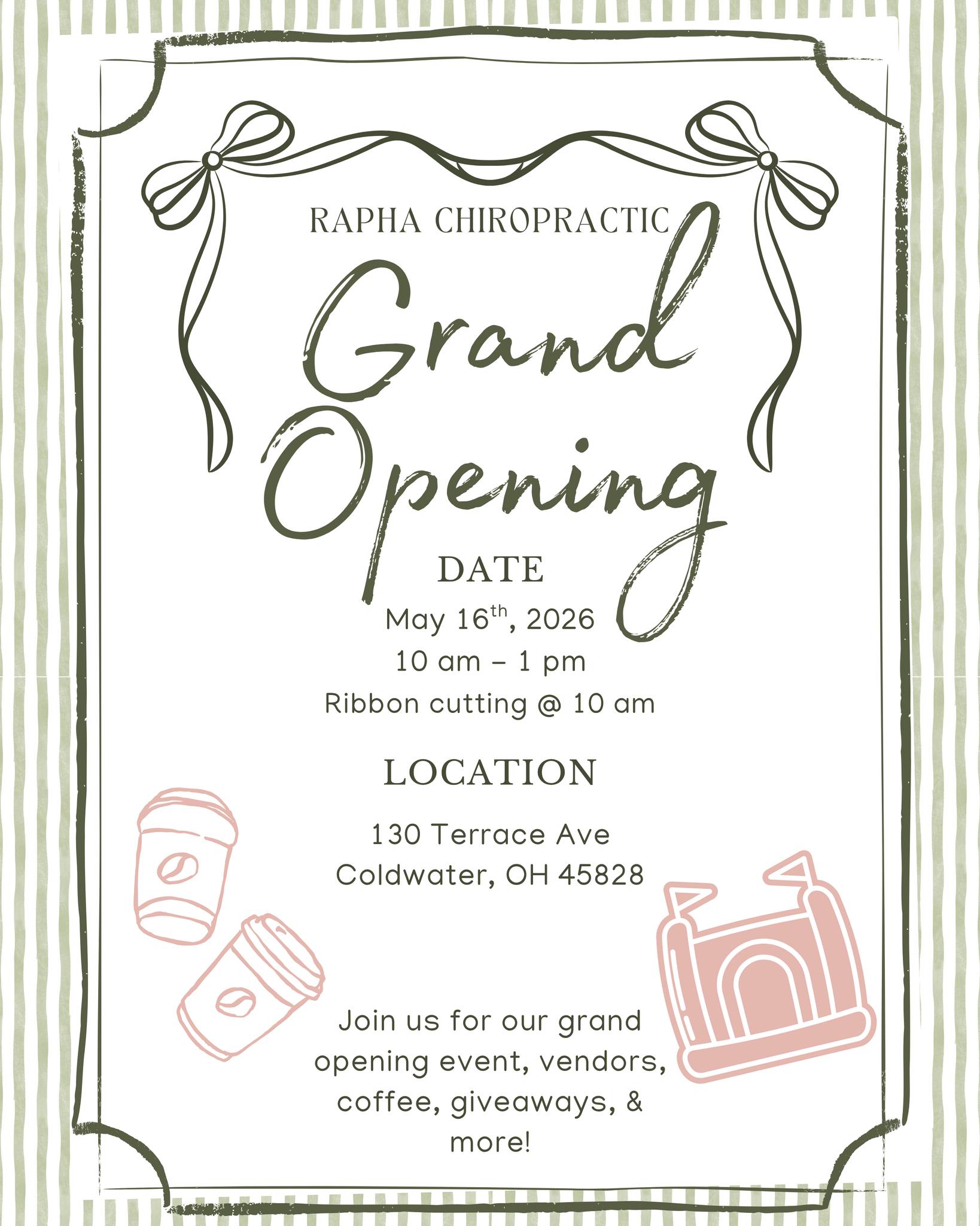 Join us in celebrating the official grand opening of Rapha Chiropractic on May 16, 2026, from 10 AM–1 PM at 130 Terrace Ave, Coldwater. The ribbon cutting will take place at 10 AM, followed by a family‑friendly open house featuring local vendors, coffee, giveaways, and more. Stop by, meet the team, and help us welcome this new business to the community.